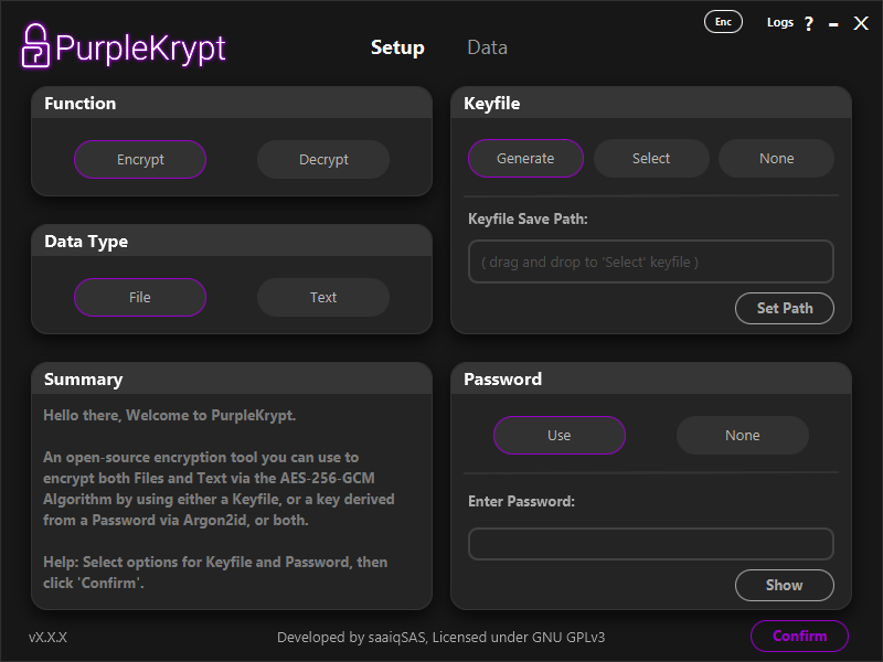 PurpleKrypt uses AES-256-GCM for secure data encryption and supports password-based encryption using Argon2id for robust key derivation, ensuring significantly stronger protection for your data.